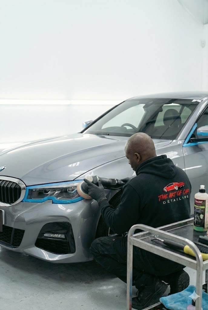 We assess the condition of the headlight lenses and surrounding trim. The area is cleaned, masked, and prepped to prevent damage to paintwork during the process.